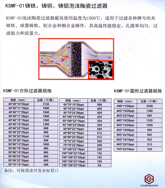產(chǎn)品類別: 鑄鐵、鑄銅、鑄鋁泡沫陶瓷過濾器—KSMF—01系列 >> 鑄鐵、鑄銅、鑄鋁泡沫陶瓷過濾器—KSMF—01系列